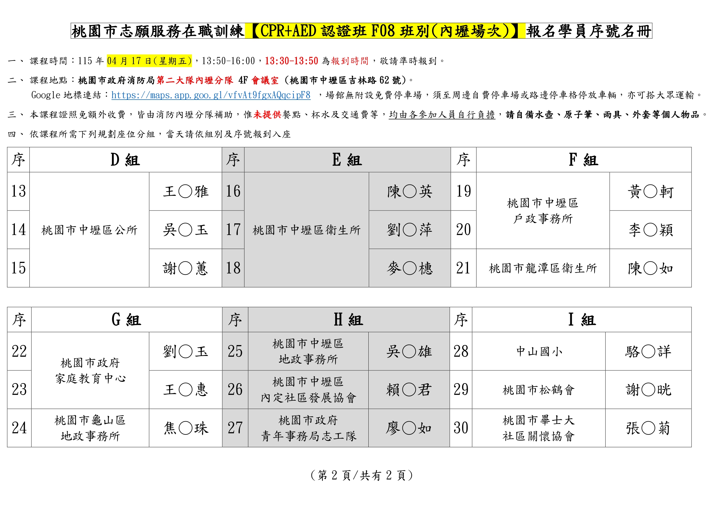 此為115/04/17(五)桃園市志願服務在職訓練CPR+AED認證班F08班別課前資訊頁面