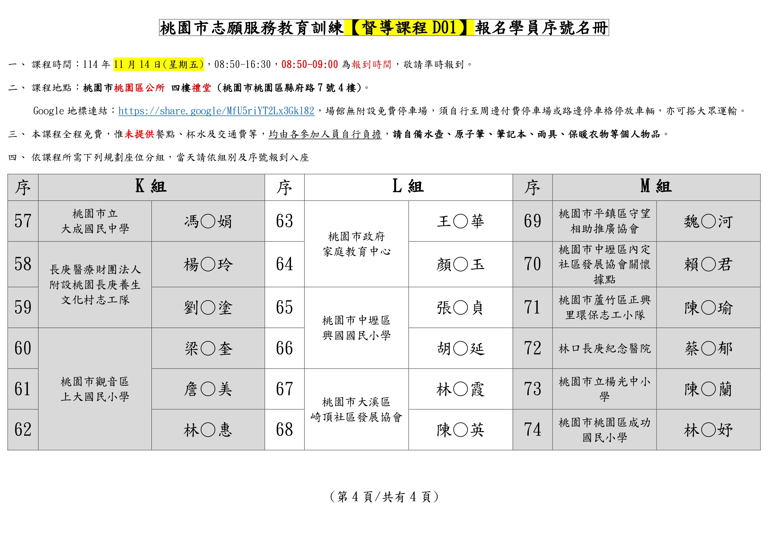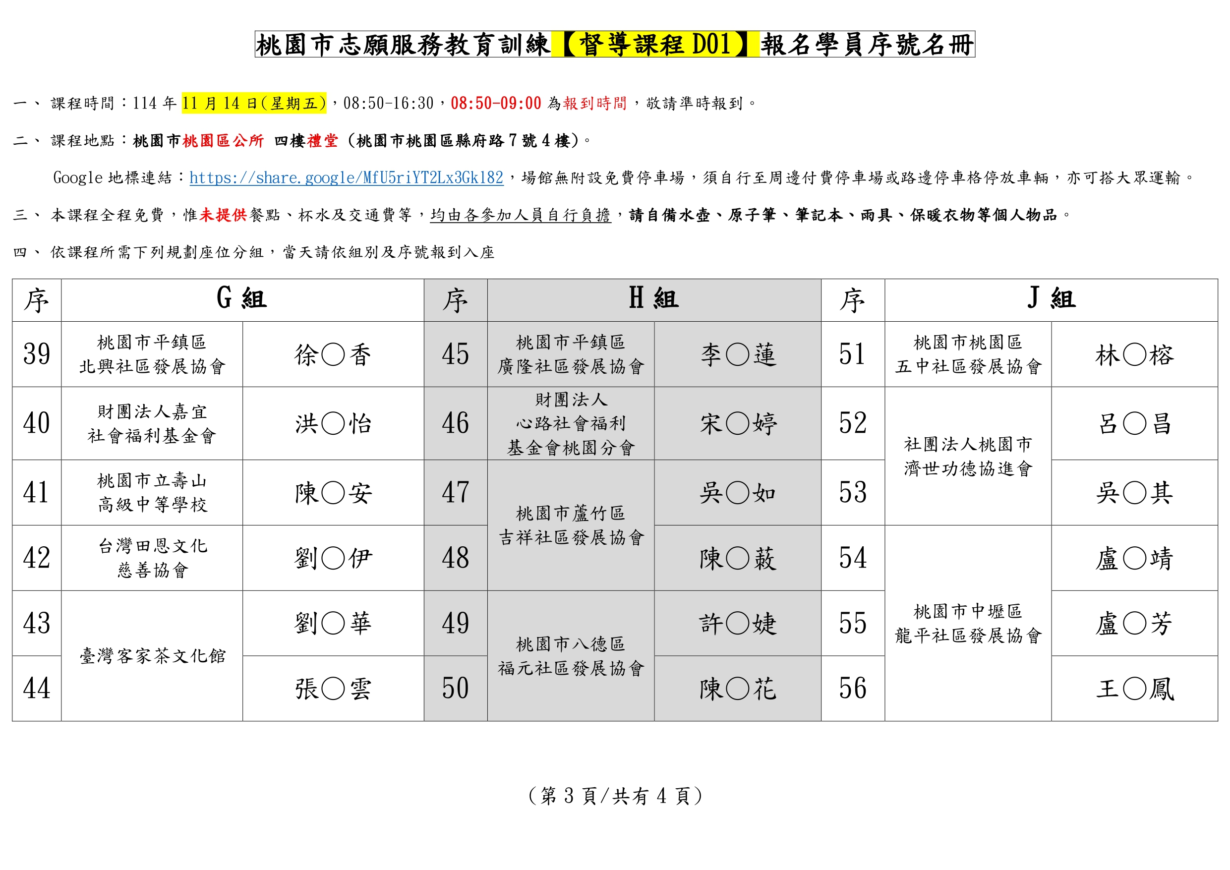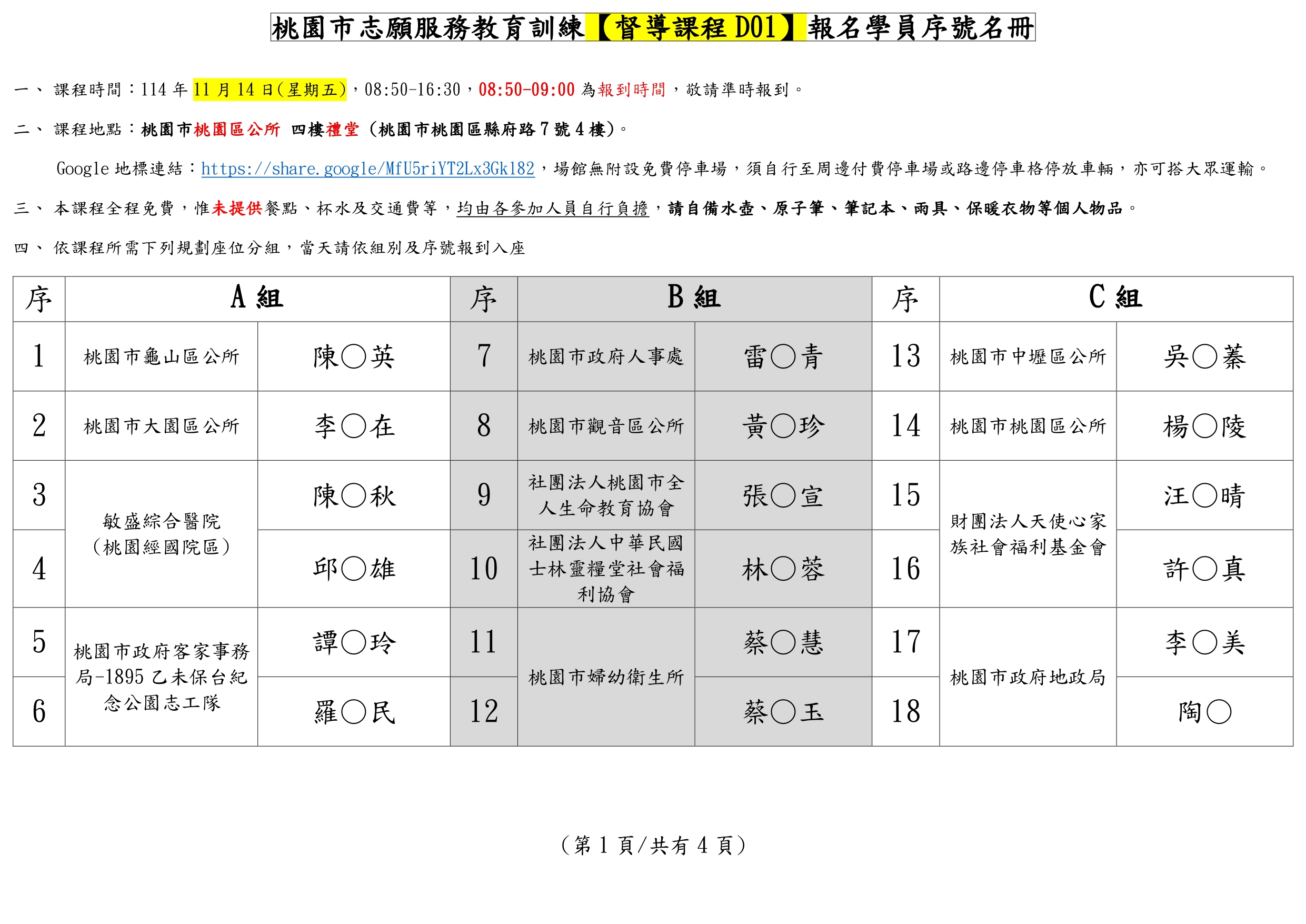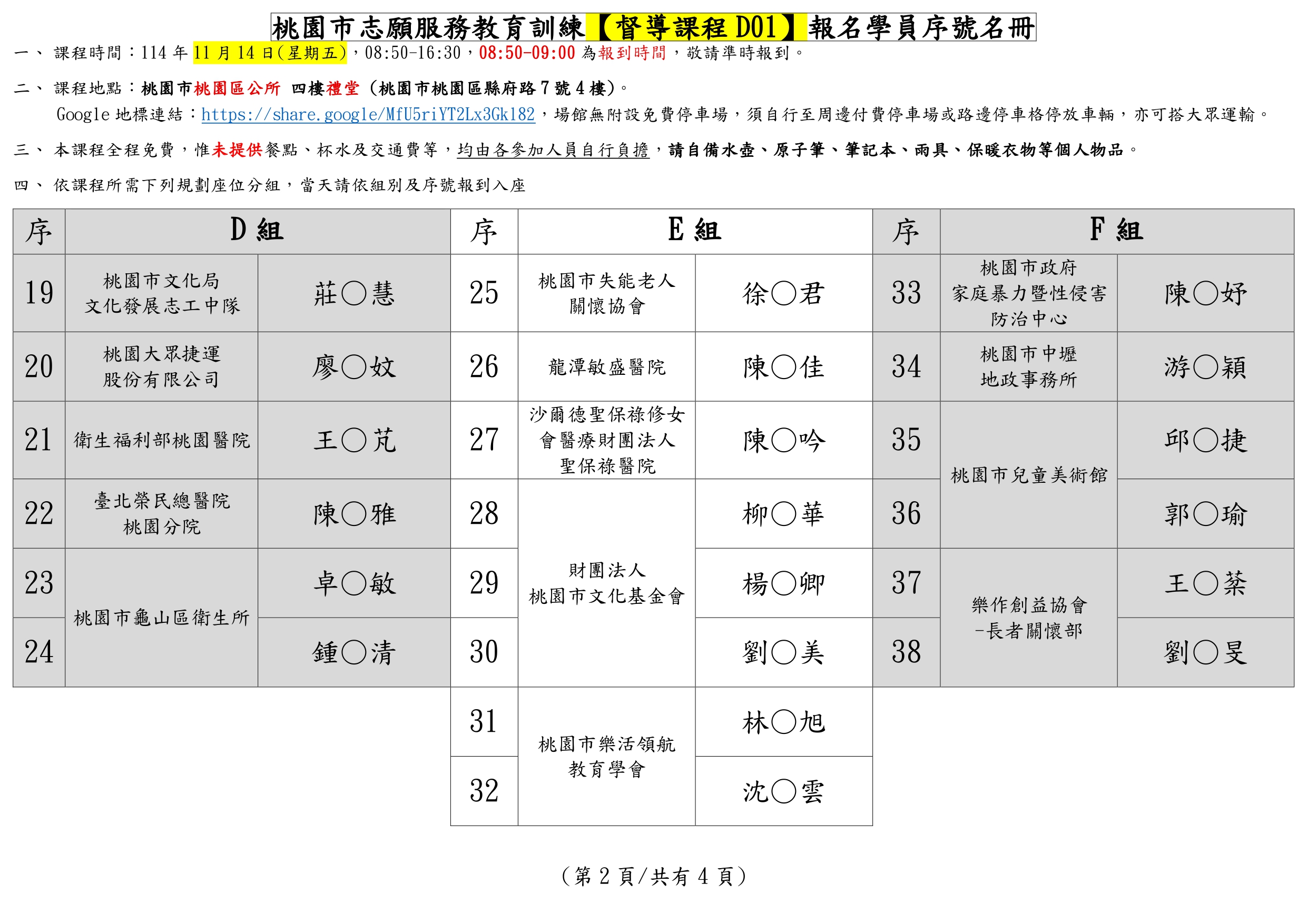 此為114/11/14(五)桃園市志願服務督導訓練D01班別課前資訊頁面