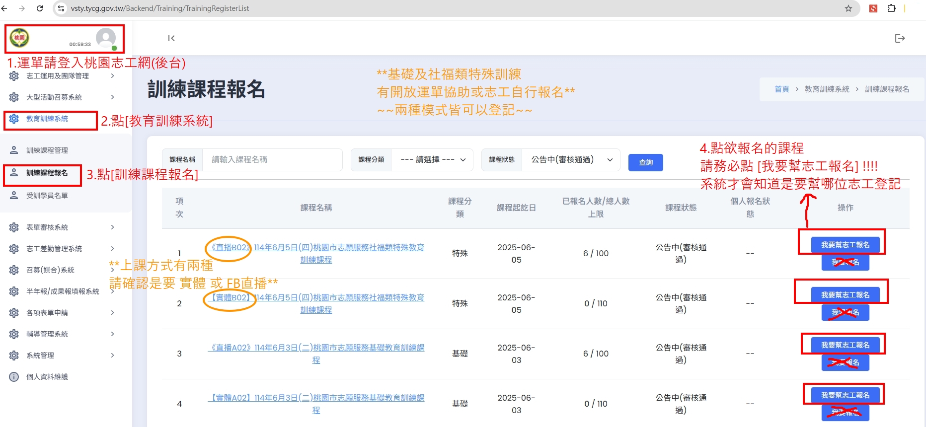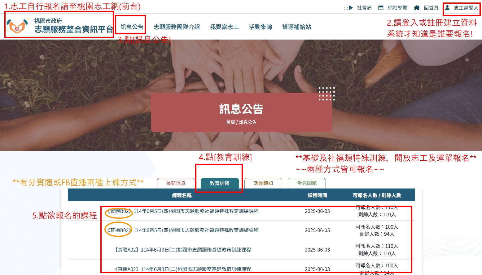 志工 自行 報名 | 進入桃園志工網→請先登入/註冊帳號→訊息公告→教育訓練→選取欲報名課程名稱→點擊「我要報名」→確認登記。 | 登入桃園志工網→志工專區 →報名資料維護→教育訓練報名→顯示「報名成功」即通過。 |