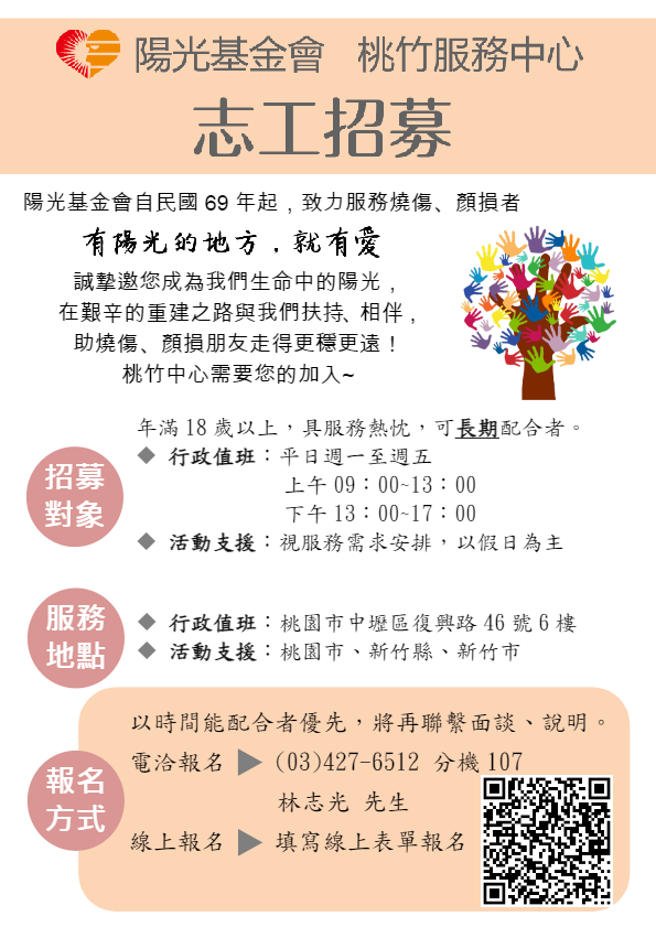 首頁 / 我要當志工 / 中壢區-陽光基金會桃竹服務中心志工召募