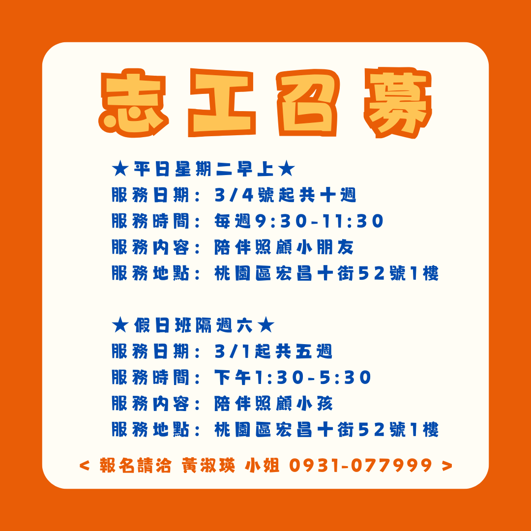 首頁 / 我要當志工 / 桃園區-社會福利類-綠之園多元繪本延伸學會 114 年繪本延伸教學種子師資培訓課程 陪伴兒童志工