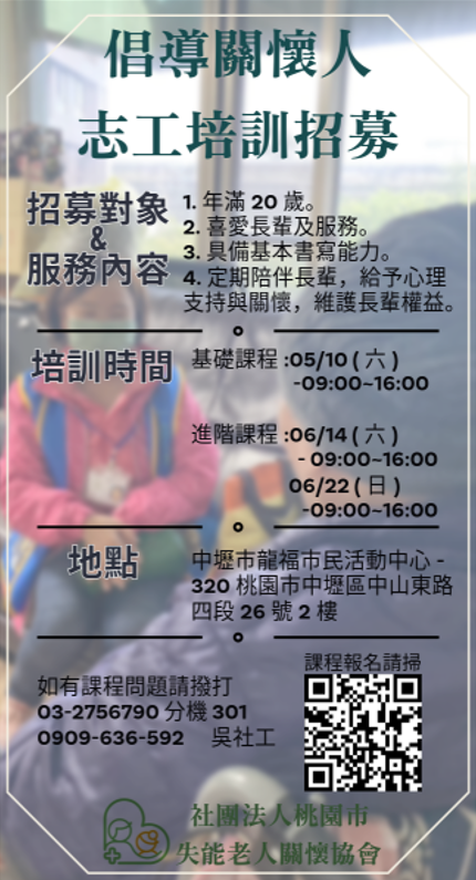 首頁 / 我要當志工 / 114年倡導關懷志工培訓課程 熱烈招生中!