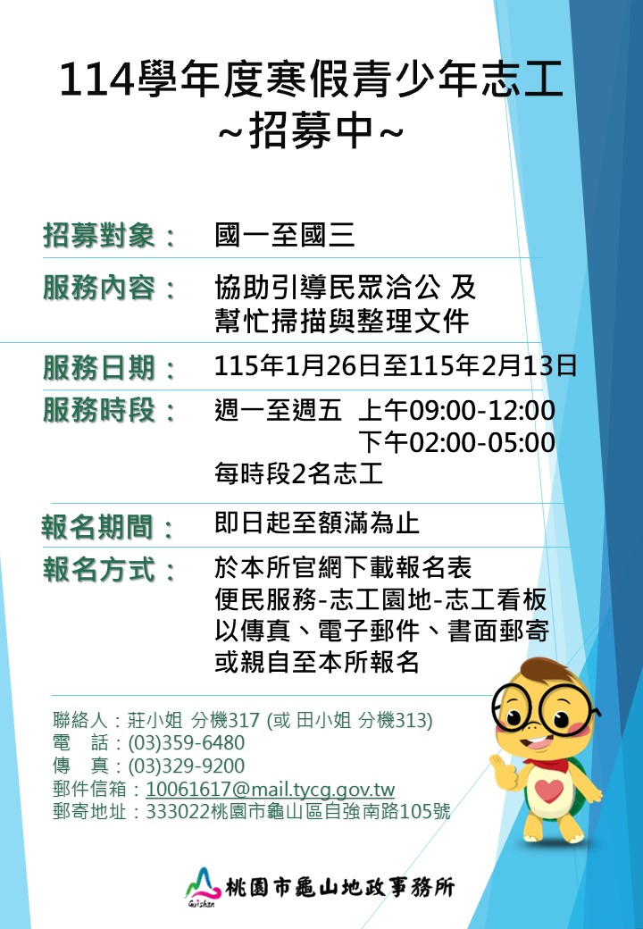 首頁 / 我要當志工 / 龜山區-地政服務類-龜山地政事務所114學年度寒假青少年志工招募