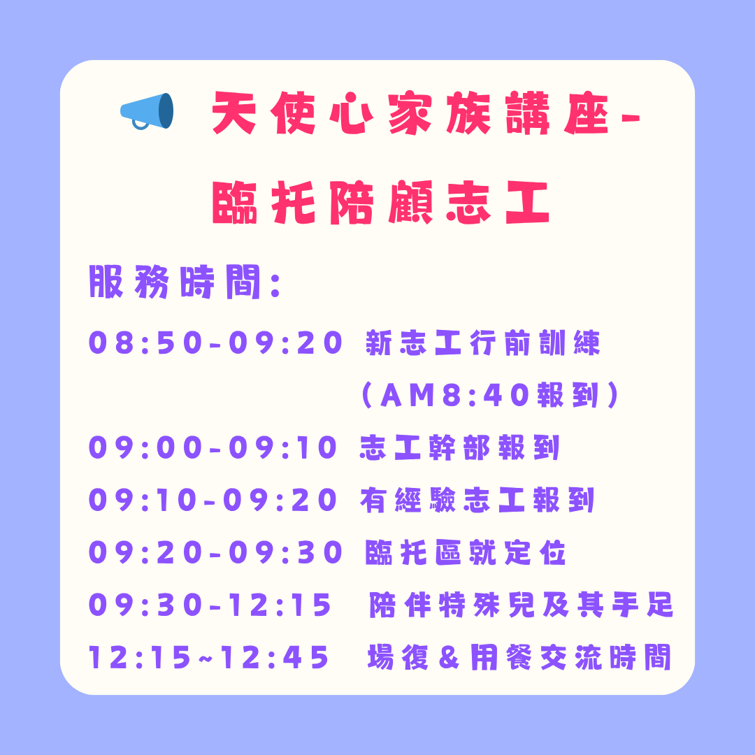 首頁 / 我要當志工 / 桃園區-青年服務類-財團法人天使心家族社會福利基金會 臨托志工
